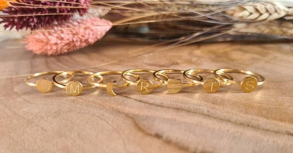Goudkleurige RVS ring met een maantje, dat je perfect kan combineren met initialen ringen!
